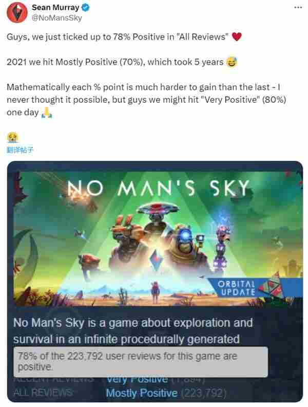 近日,《无人深空(NoMan’sSky)》官方发文庆祝游戏在Steam上整体好评率上涨了1%,主创SeanMurray表示,他们花了5年才让游戏变成了“多半好评”,每上升一个百分点都比之前更加困难。或许有一天,这款游戏真的能达到“特别好评”...
